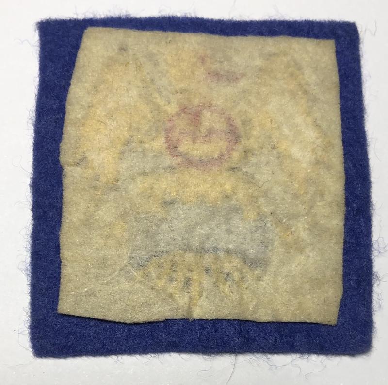 Good scarce blue felt rectangle embroidered with yellow eagle with white coronet; red “M” in circle on the breast.