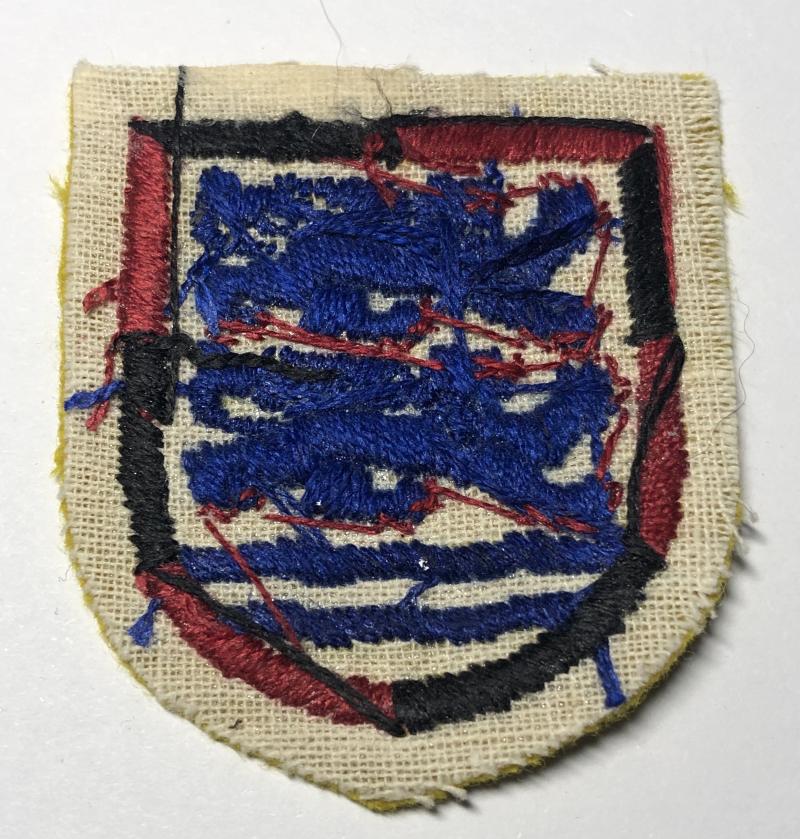 Good scarce Newport Pagnell arms, viz yellow felt shield embroidered with two blue lions over two blue waves set in red and black alternate border.