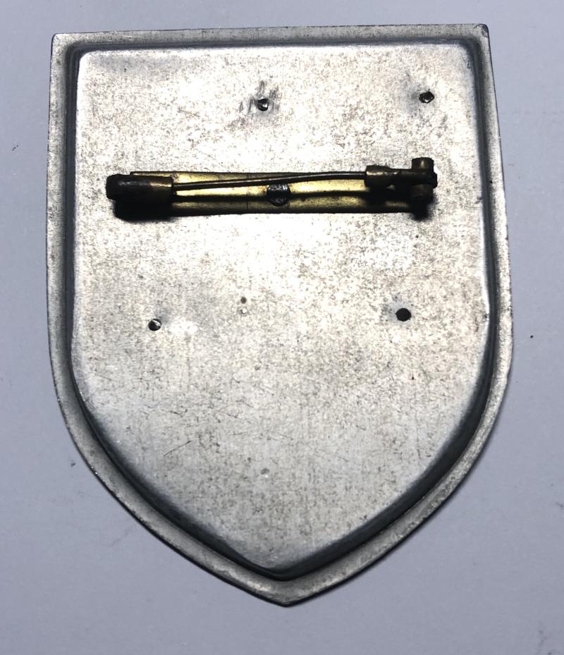 Fine rare aluminium shield with russet felt insert bearing BEJA tablet and central Panzer tank pierced with Crusader sword. Original pin fitting to reverse. Worn on right sleeve or right breast pocket of battledress.