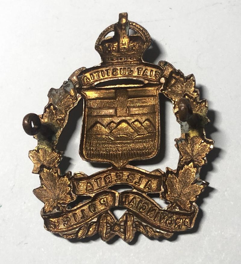 Good rare die-stamped brass crowned FIAT JUSTITIA scroll surmounting Maple sprays; Coat of Arms on voided centre resting on ALBERTA PROVINCIAL POLICE scrolls. Loops