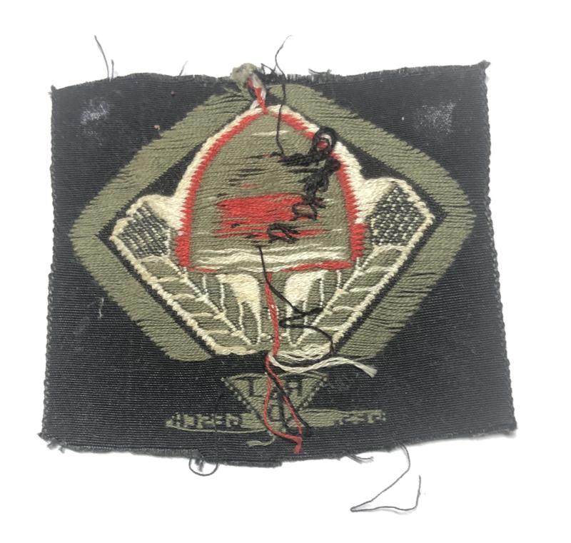 Good scarce BeVo weave example on black. Khaki diamond shape bearing red rimmed spade with black swastika flanked by ears of wheat. Triangular RADJ below with GAS. GESCH.