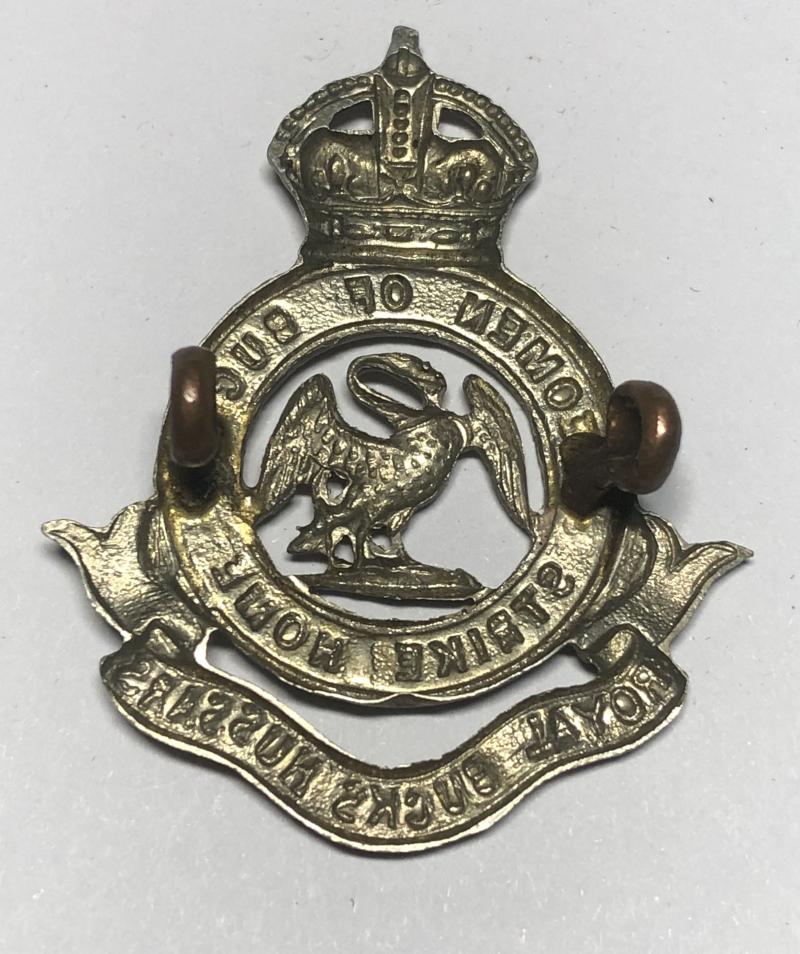 Fine die-stamped white metal crowned YEOMEN OF BUCKS STRIKE HOME circlet resting on ROYAL BUCKS HUSSARS scroll; Swan to voided centre. Loops