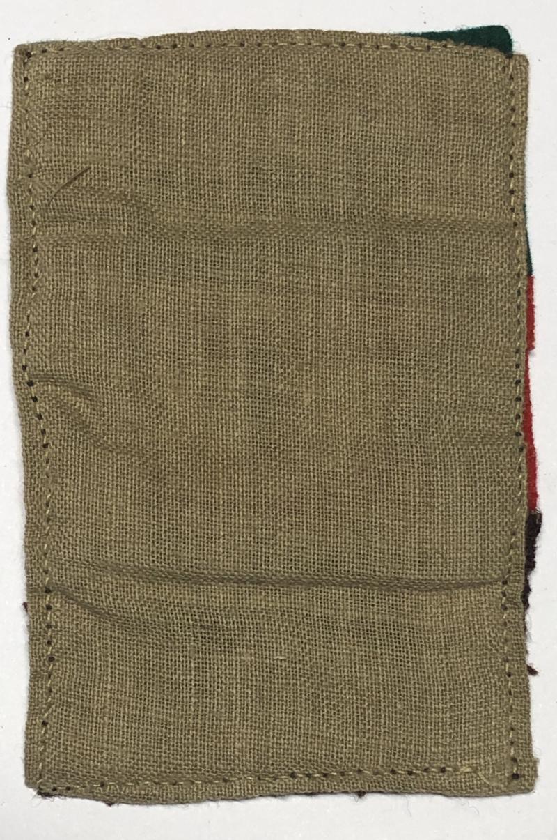 Good scarce example comprising equal horizontal colours of green over red over brown. The central red portion with black embroidered 1.LT. Khaki muslin backing.