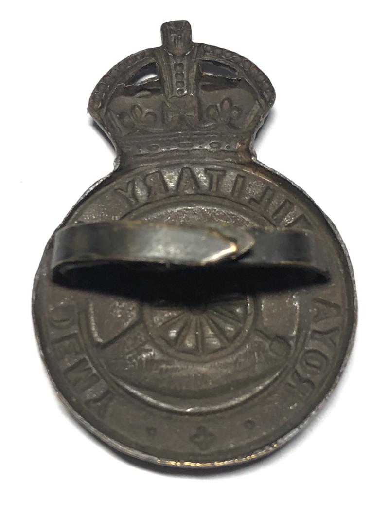 Good die-stamped bronze crowned ROYAL MILITARY ACADEMY circlet with gun to centre. Blades. RMC Sandhurst amalgamated with RMA Woolwich (known as The Shop) in 1947.
