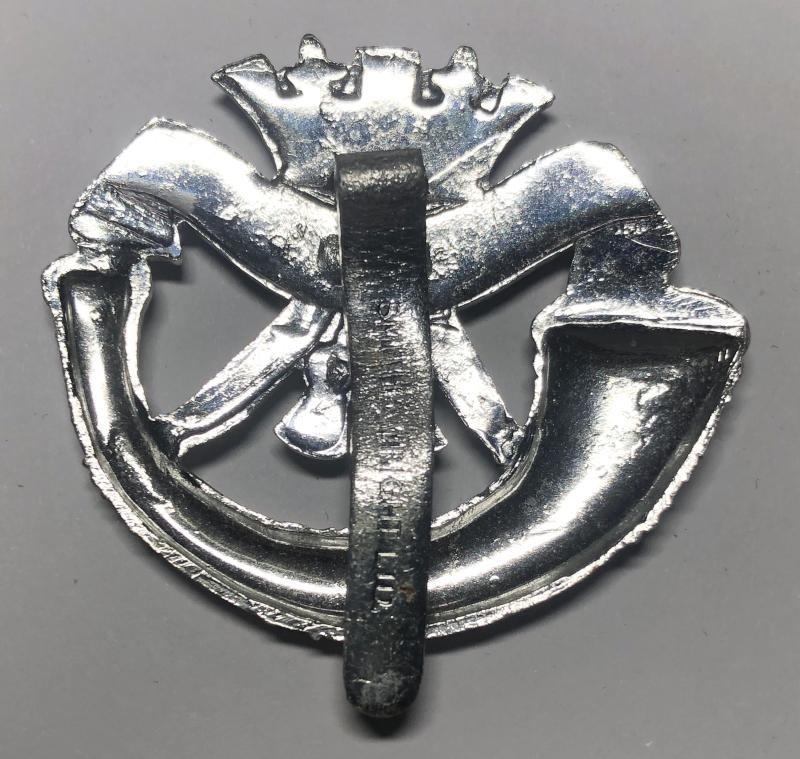 Good scarce strung bugle surmounted by coronet resting on CORNWALL scroll. Slider. Service wear