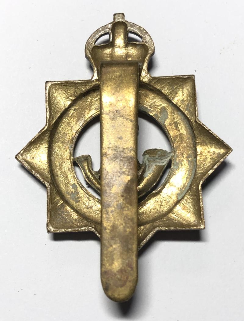 Good scarce die-cast British made post 1903 issue. Crowned star, bearing a strap “Madras & S. Mahratta Rly Rifles”; strung bugle to centre. Slider
