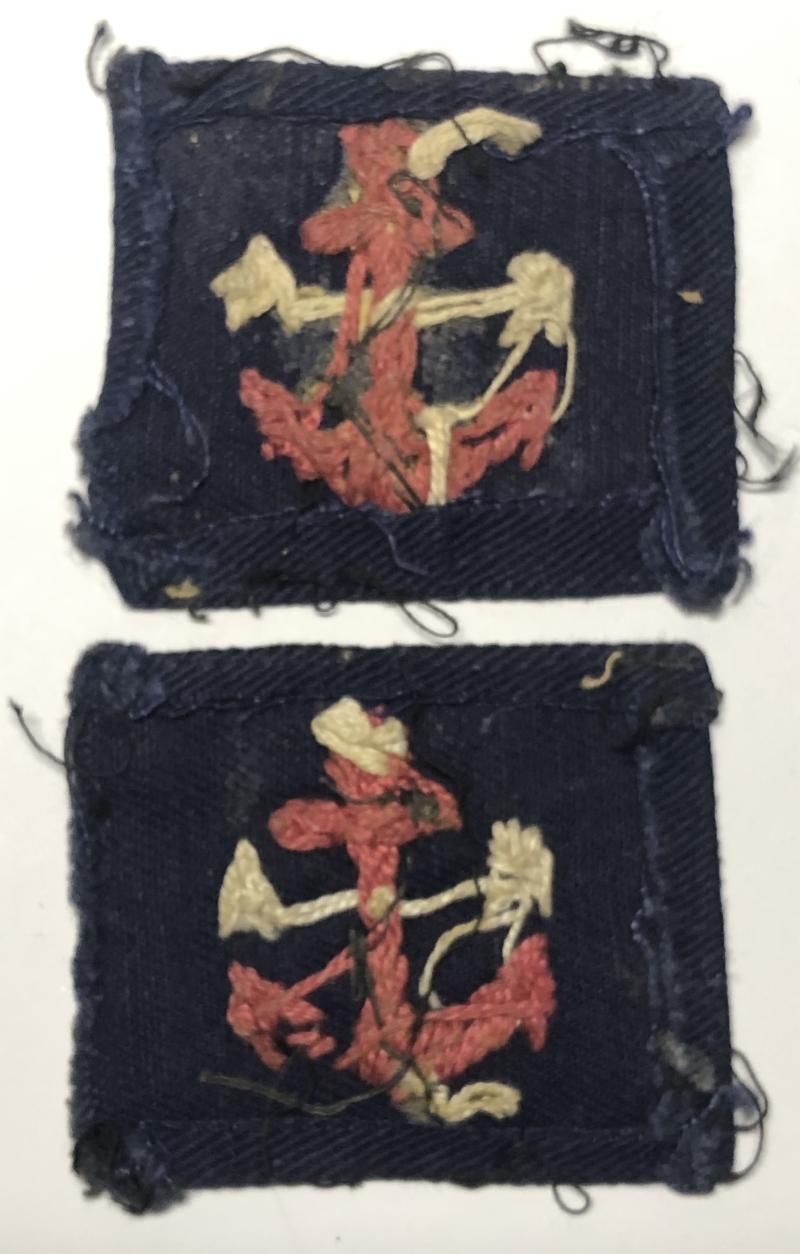 Good scarce used pair of dark blue rectangles embroidered with white R A; red fouled anchor between the letters.