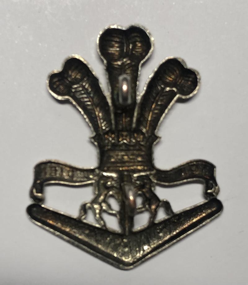 Good scarce die-pressed silvered Prince of Wales's plumes, coroner and motto over facing horses resting on boomarang bearing unit title. Vertical loops.