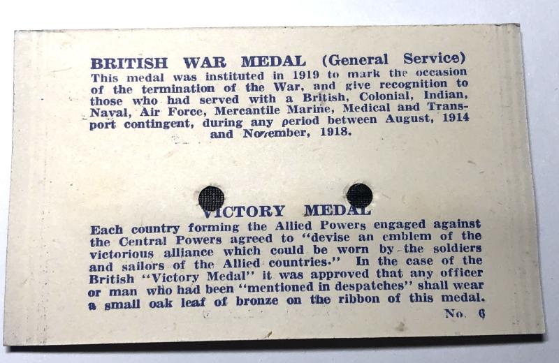 Good example of the sew-on medal ribbons for British War Medal and Victory Medal with original card backing. Inter war stock from tailor's shop that closed in the 1970's.