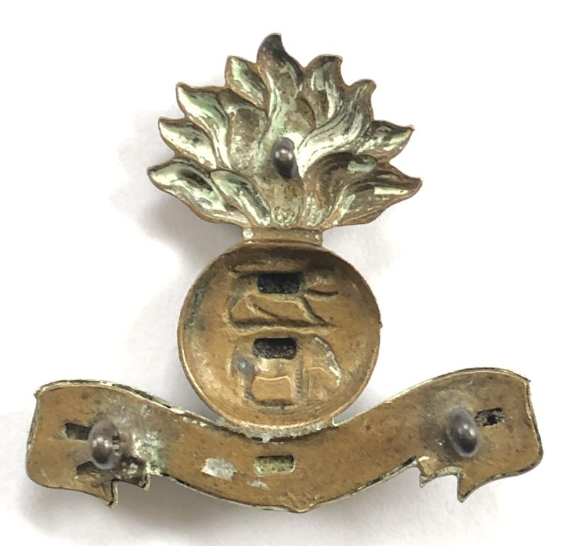 Good scarce brass flaming grenade on white metal ROYAL DUBLIN FUSILIERS scroll; the ball mounted with Tiger and Elephant in white metal. Three toned loops