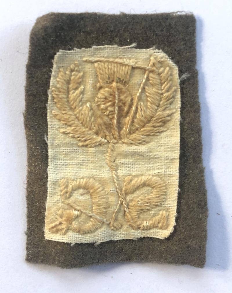 Good scarce white embroidered Thistle over S.G. on khaki felt rectangle.