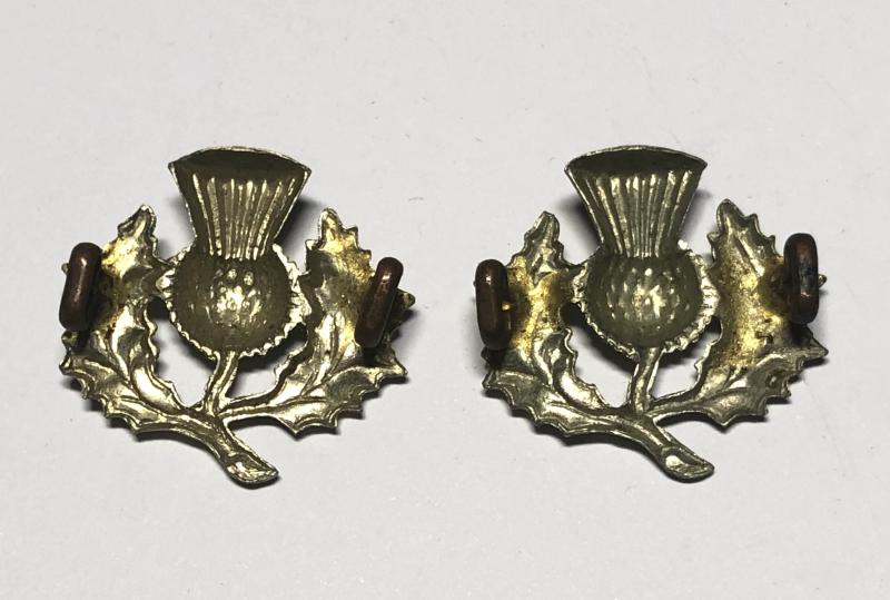 Good scarce small die-stamped white metal thistles on loops. Originally worn on a blue felt disc