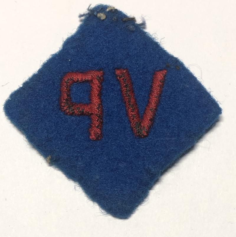 Good scarce post 1941 blue felt diamond embroidered with red letters VP. Removed from battledress.