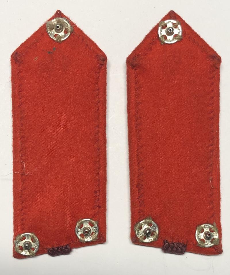 Good scarce scarlet fine felt tabs bearing applied crimson silk woven line terminating in gilt mounted GVIR Staff button. Silk lined each with three press studs,