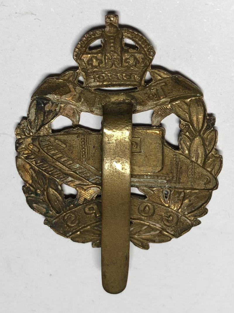 Good scarce die-stamped brass crowned laurel sprays bearing scrolls TANK CORPS with tank to voided centre. Slider Introduced 1917.