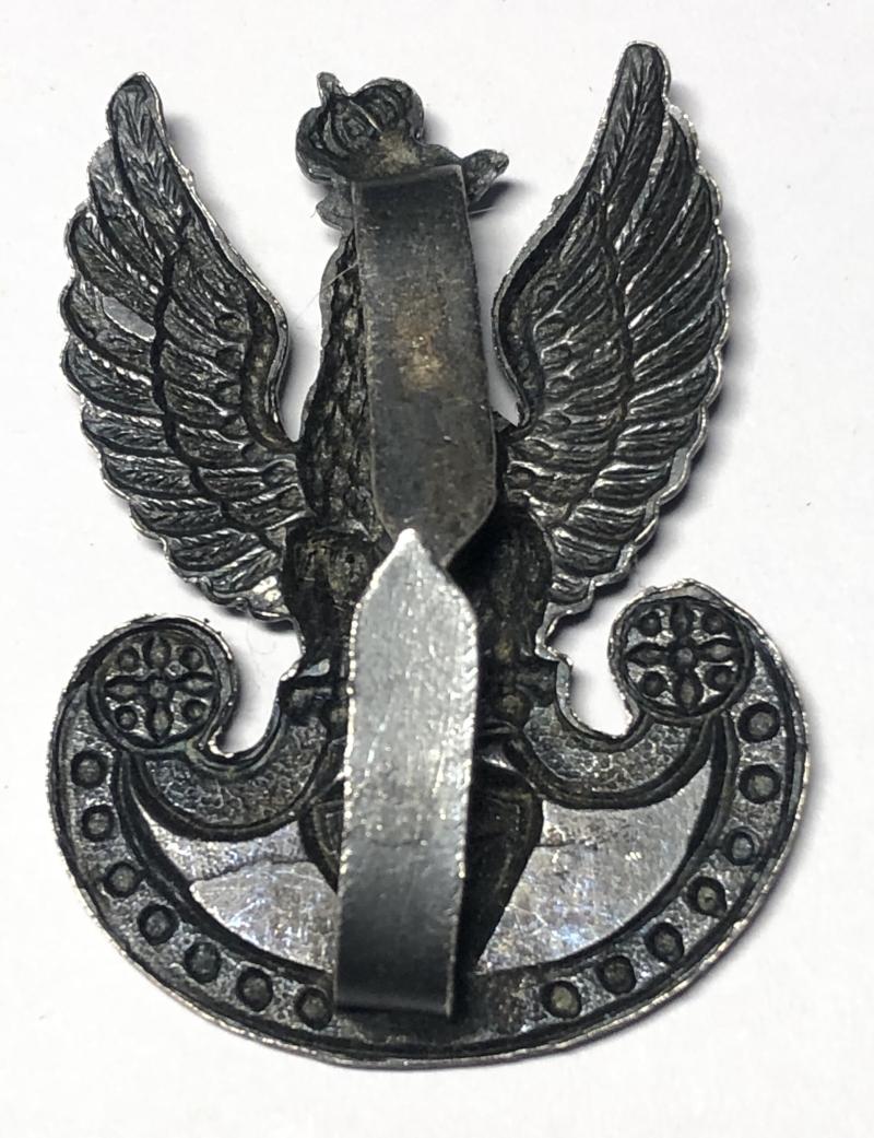 4 cm high Good scarce small size British made die-stamped white metal silvered crowned eagle on Amazon shield bearing 13 nails and small shield within. Blades