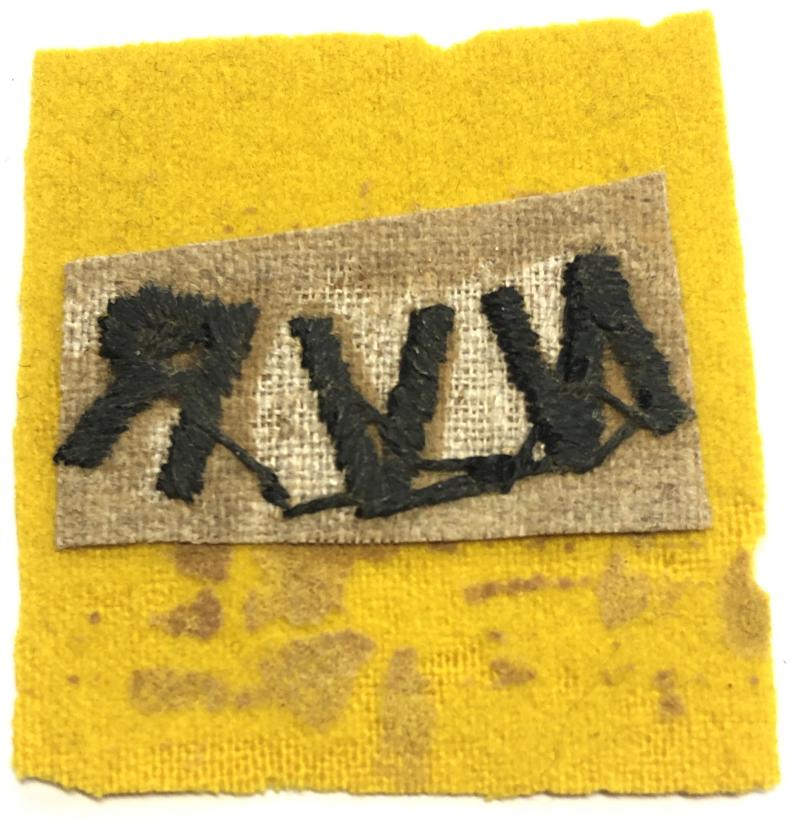 Good scarce yellow felt square embroidered with thick black letters N.V.R in upward curve.