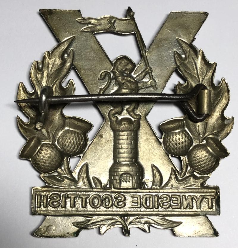 Good scarce die-stamped white metal, the Lion with both hind legs on the tower. Original stout pin and hook