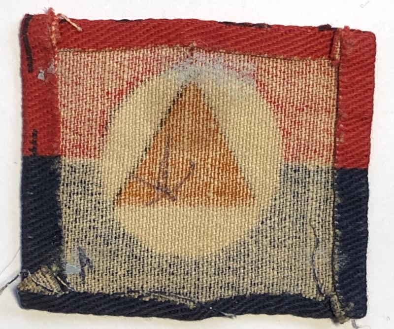 Good scarce golden triangle in white disc superimposed on blue over red rectangle printed example by Calico Printers.