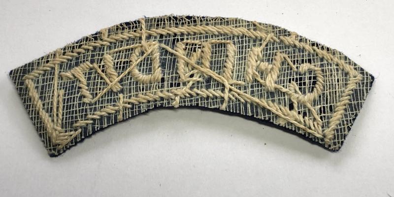 Fine scarce British made unofficial example. White sans-serif letters in a white border embroidered on blue felt.