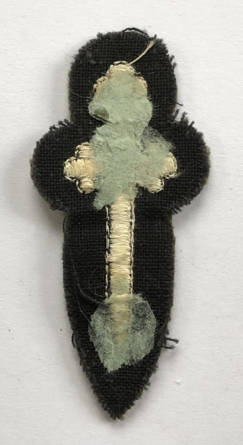 Good scarce black edged white downward crusader sword embroidered on khaki felt. Adopted July 1942.