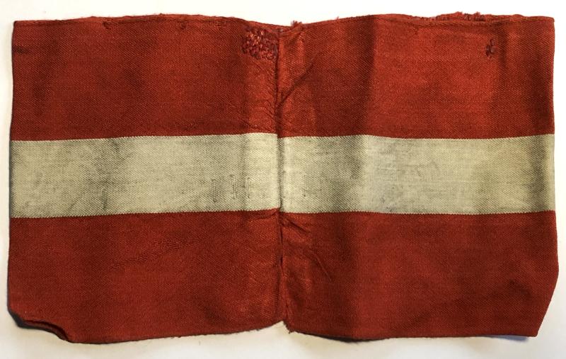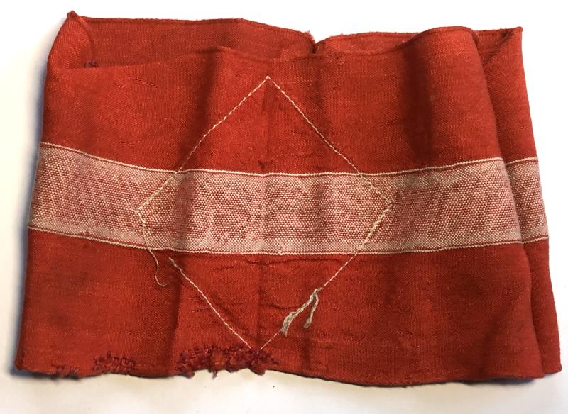 Good red cotton band with central white line overlaid with a white diamond printed with black mobile swastika. Service wear and period darns.