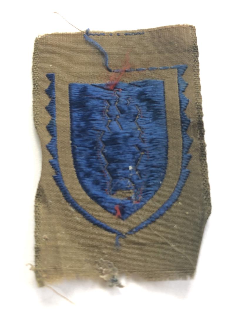 Good scarce grey silk rectangle embroidered with Red Hand of Ulster with blue shield shaped border.