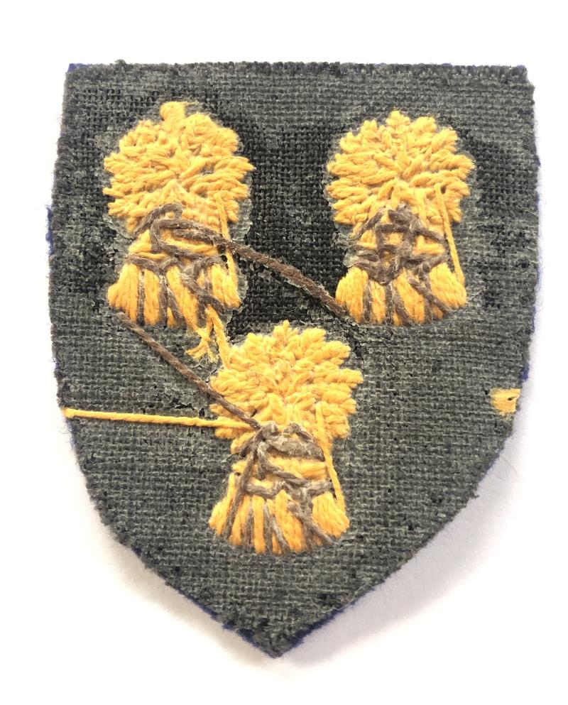 Good example of three yellow wheatsheaves embroidered on blue shield. Removed from uniform.