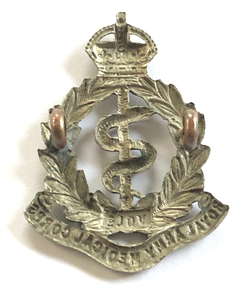 Good scarce die-stamped white metal crowned oval laurel wreath, bearing VOLS tablet, resting on ROYAL ARMY MEDICAL CORPS scroll; the rod and serpent of Aesculapius to voided centre. Loops